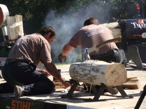 Finally they had a relay in which the men had to cut through a large log while standing on it, and then proceed to other bizarre but manly tasks. I was alarmed to see the young man closest to us flinch in his task, take a quick look at this foot, and then continue with his chopping. He had just chopped into his foot.